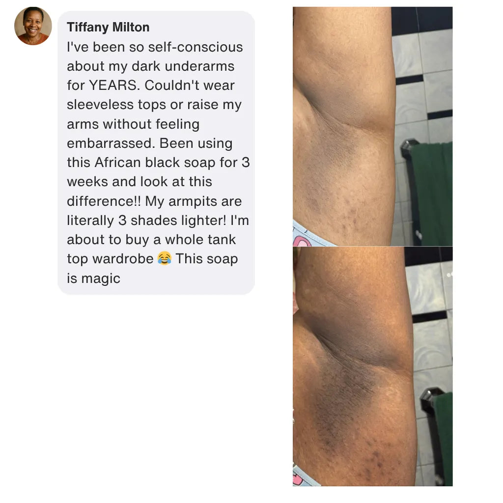 Every single ingredient in our soap is carefully selected with one purpose: To fade dark spots and clear breakouts as effectively as possible while nurturing skin health long-term. Ensuring hyperpigmentation doesn't return and your skin stays balanced. All ingredients are sourced in their purest, most potent form from Ghana - unlike other brands that use diluted synthetic versions or harsh chemicals that can worsen pigmentation.